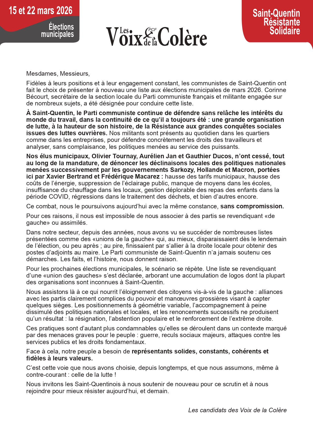 Eléctions municipales, la liste integrale présentée par le PCF et conduite par Corinne Bécourt